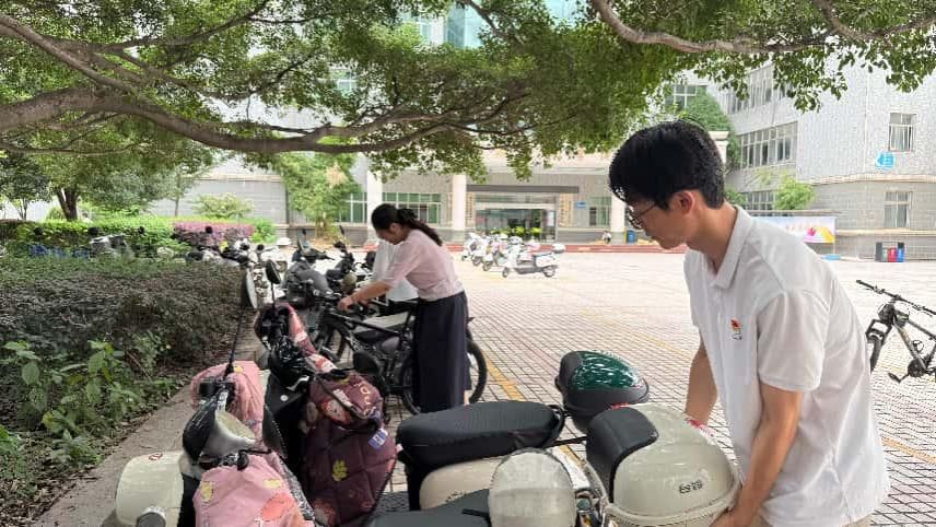 上午10点,志愿者们分组前往教学楼主楼、明德楼、宿舍楼等电动车集中停放区域开展服务。活动中,教师们将占道、倾斜的电动车逐一挪移至指定停车线内,确保车辆整齐排列、留出安全通道。经过一个半小时的整理,原本杂乱的停车区变得井然有序,充分展现党员的良好形象。