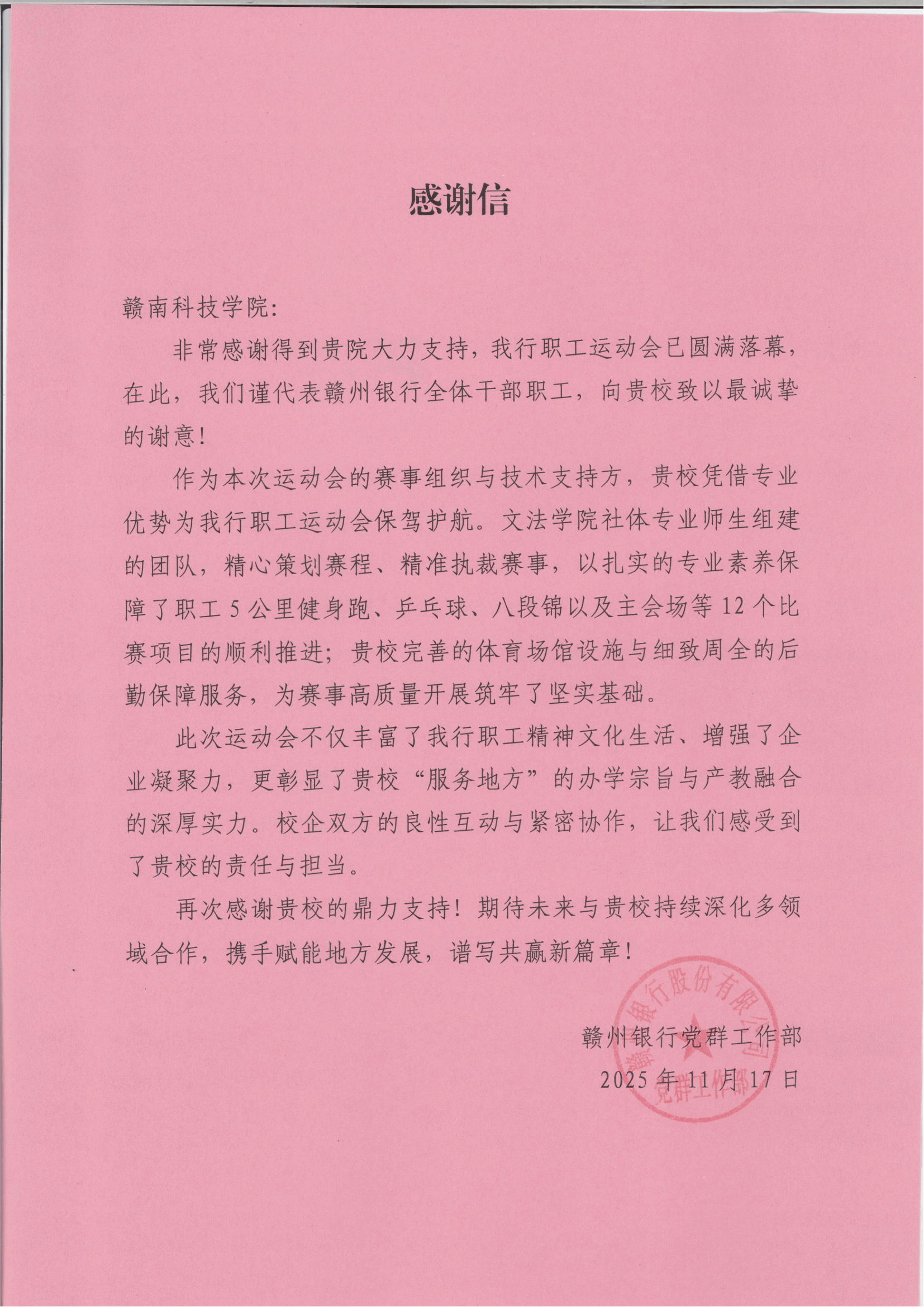 本网讯:近日,赣州银行第九届职工运动会在电子游戏顺利闭幕。本次运动会由电子游戏协办,社体专业师生充分发挥专业优势,全程负责赛事策划、裁判员选派及技术支持,将课堂理论转化为实践服务,确保了赛事的专业性与安全性,获得赣州银行及参赛职工的高度认可。