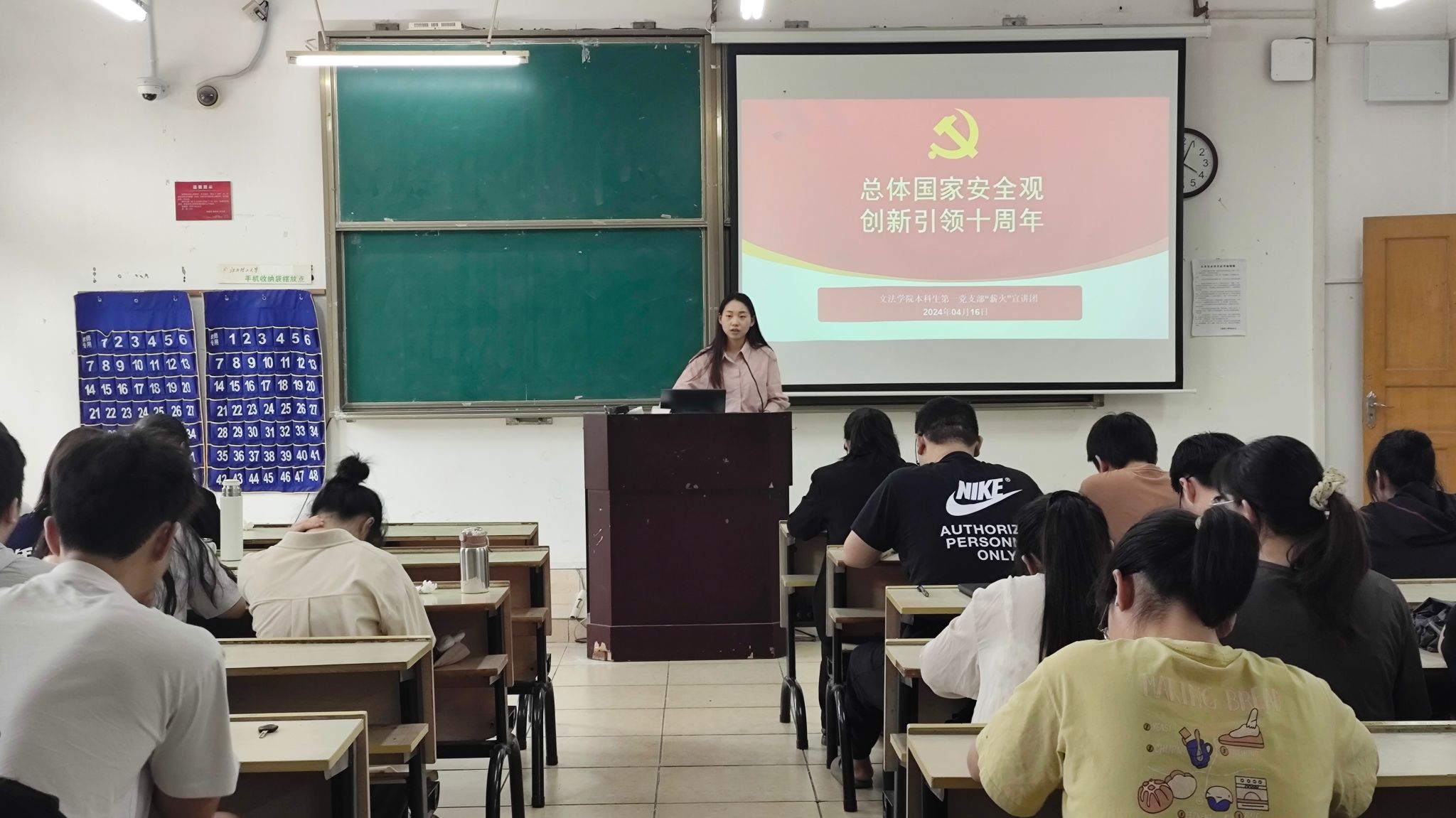 本网讯:为全面贯彻总体国家安全观,切实增强大学生的国家安全意识,凝聚维护国家安全的共识和力量。4月16日下午,pg娱乐电子游戏官网入口本科生第一党支部“薪火”宣讲团面向2022级学生开展“总体国家安全观•创新引领10周年”主题宣讲活动。