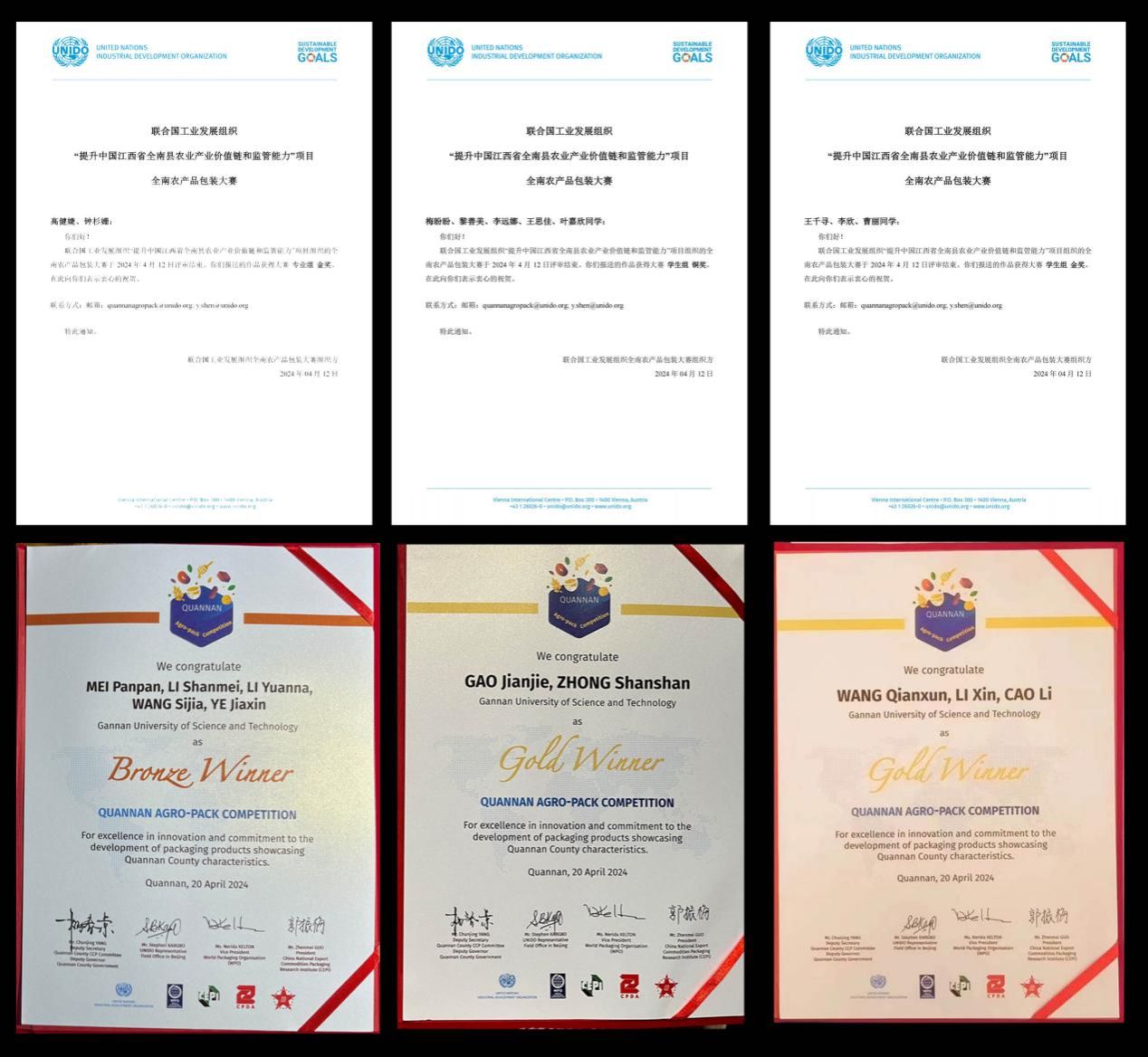 图一:联合国工业发展组织颁发的全南农产品包装设计大赛专业组金奖、学生组金奖及铜奖证书(图为电子游戏师生在联合国工发组织全南农产品包装大赛颁奖现场与国务院商务部及省市领导合影留念)。