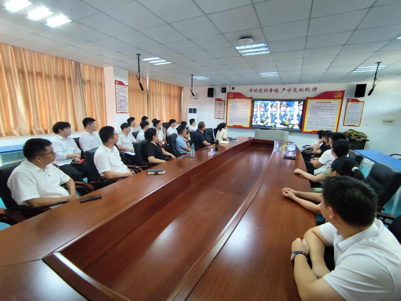 本网讯:9月3日上午,纪念中国人民抗日战争暨世界反法西斯战争胜利80周年大会暨阅兵式在北京天安门广场盛大启幕,为铭记这一具有重大历史意义的时刻,学院积极响应号召,组织在校师生在明德楼201会议室共同见证这一伟大盛典。学院领导班子成员、各办公室负责人、全体辅导员以及在校学生党员齐聚一堂。