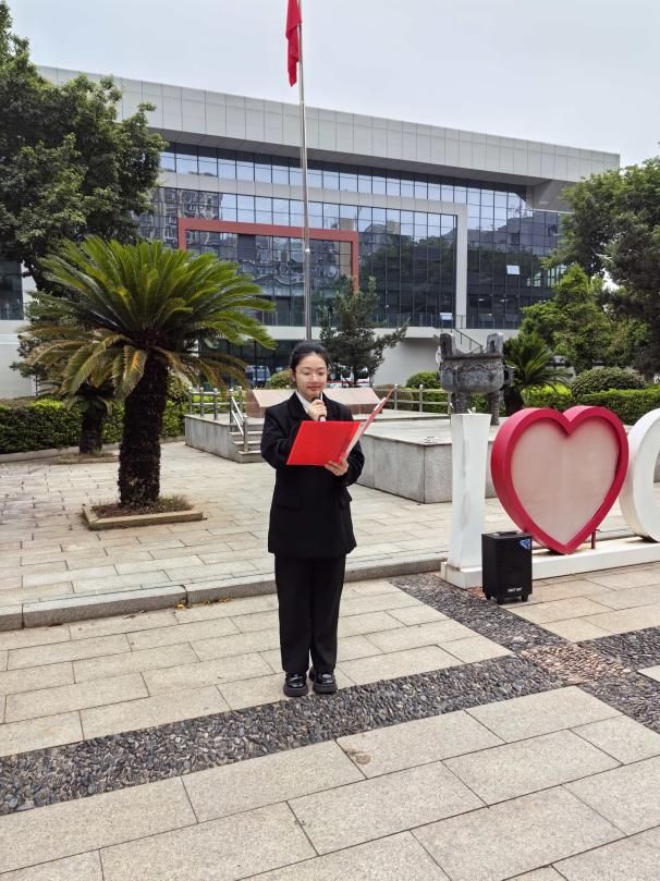 仪式中,学生代表社体242班孙颢桐作了题为《血色黎明中的绝笔》的主题演讲。他动情讲述了赵云霄夫妇两位早期中共党员,于1928年被捕并先后英勇就义的事迹。在牺牲前夕,赵云霄在狱中生下女儿启明,并写下了一封感人至深的绝笔家书。这封家书字字千钧,承载着革命者舍小家为大家的坚定信仰与深沉家国情怀,深刻展现了共产党人为民族解放和人民幸福不惜牺牲一切的崇高精神。