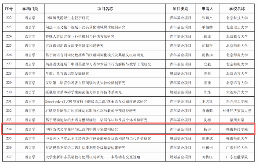 本网讯:9月25日,教育部社会科学司正式公布2025年度教育部人文社会科学研究一般项目评审结果。电子游戏pg娱乐电子游戏官网入口葡萄牙语专业教师杨宇申报的《中国当代文学葡译与巴西的中国形象建构研究》成功获批青年基金项目。