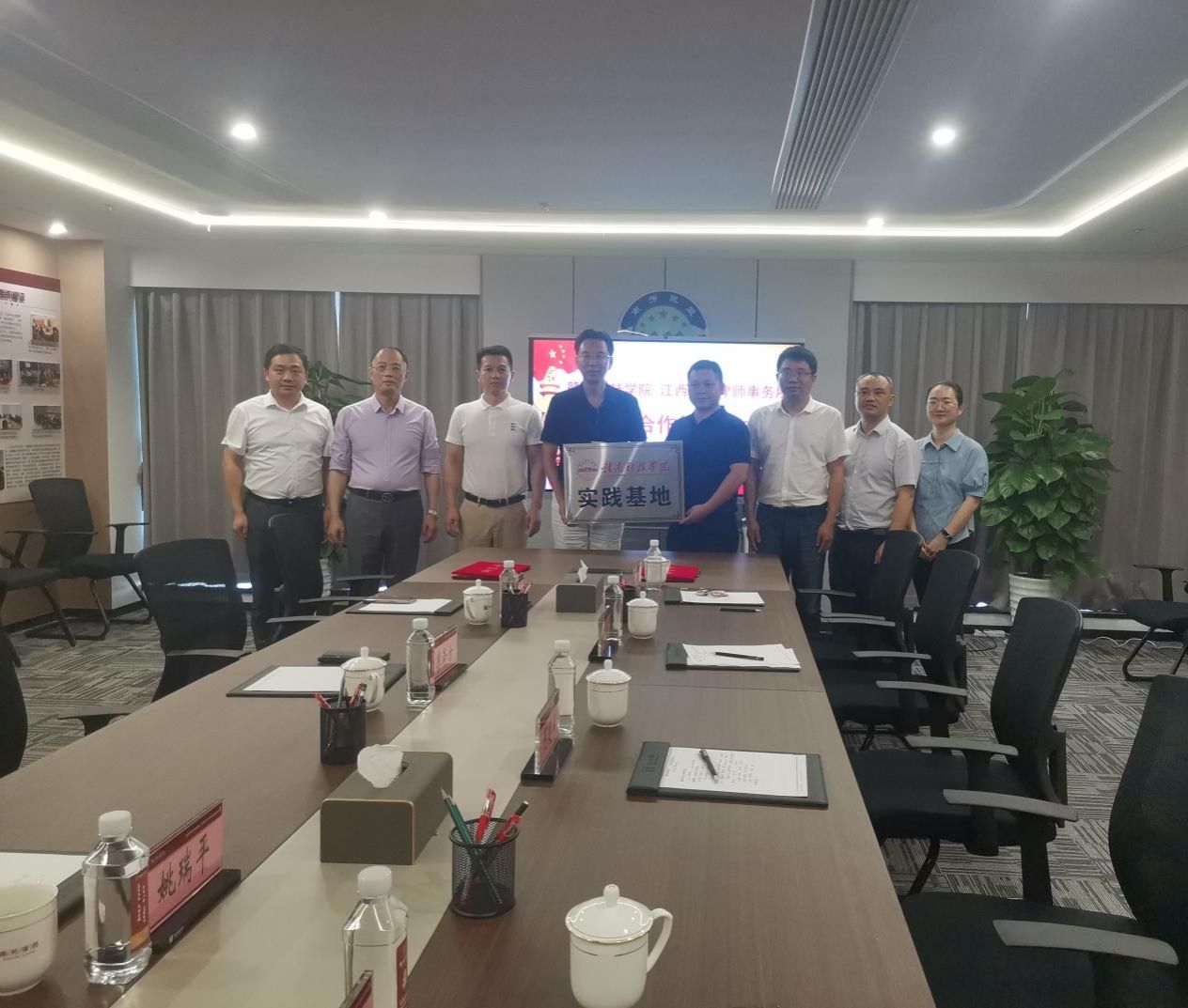 座谈会上,廖泽芳对李国鹏一行的到来表示热烈欢迎,并介绍了江西南芳律师事务所的基本现状、未来发展及岗位需求等情况。李国鹏介绍了学校的基本情况、历史沿革以及专业建设取得的成果。双方围绕法律服务人才培养、法律学术交流研讨、法学实践教学以及创新院所合作模式等方面进行了深入的交流与探讨。双方代表在会议室现场签订了校企合作协议,并为“pg娱乐电子游戏官网入口实践基地”揭牌。