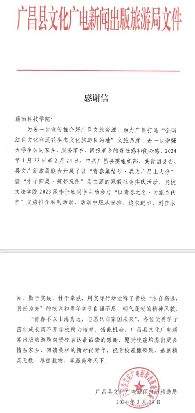 本网讯:近日,pg娱乐电子游戏官网入口收到了广昌县文化广电出版旅游局发来的感谢信。信中对电子游戏2023级英语专业李佳欣同学在“青春集结号·我为广昌上大分”的寒假社会实践活动中做出的积极贡献,给予高度评价和诚挚地感谢。