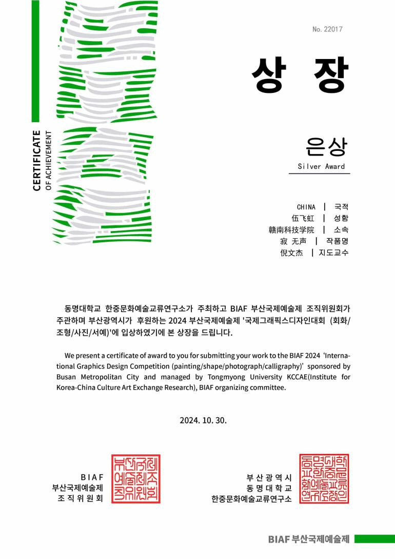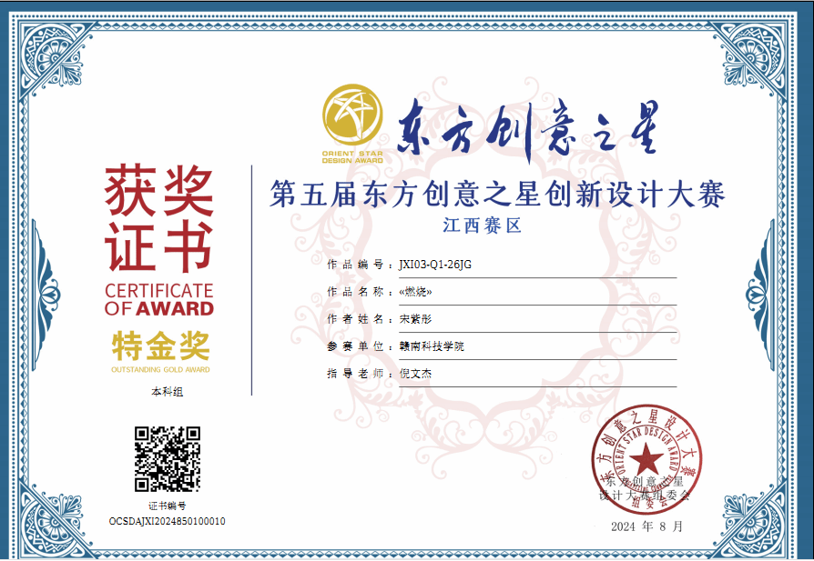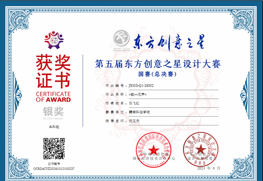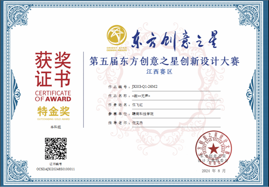 电子游戏学子在2024年(第5届)东方创意之星设计大赛中获得各类奖项近二十项,其中环境设计专业201班伍飞虹作品《寂》、《无声》喜获省赛特金奖、国赛银奖和国际赛银奖三项大奖,设计学221班宋紫彤作品《燃》获省赛特金奖,倪文杰老师获得优秀指导教师、优秀组织教师奖,我获得优秀组织单位奖。