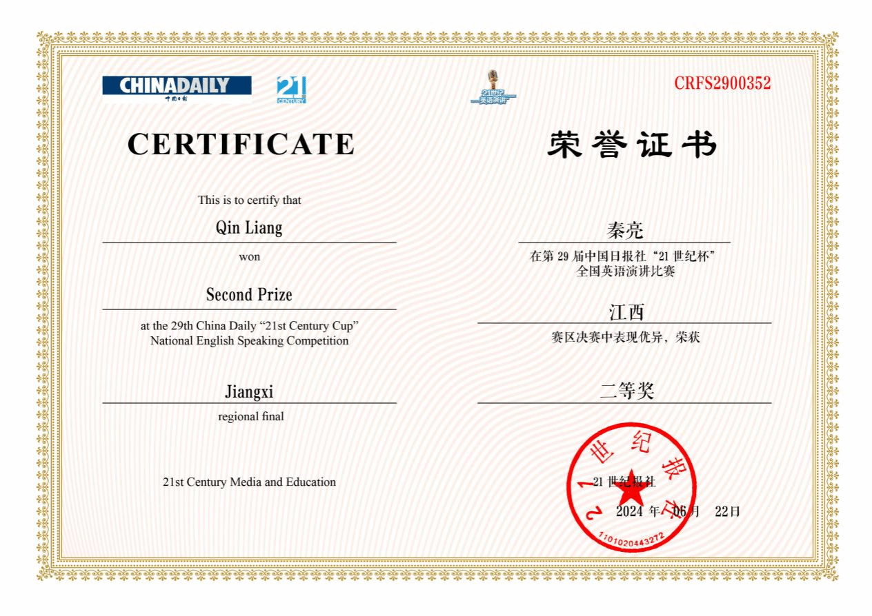 6月22日,第29届中国日报社“21 世纪杯”全国英语演讲比赛江西赛区复赛在江西农业大学顺利举行,电子游戏自动化222班秦亮,英语222班邹婧乐分获江西赛区二等奖、三等奖。秦亮同学将和来自全省其它高校的九位同学代表江西赛区参加十月份在北京举办的全国半决赛。