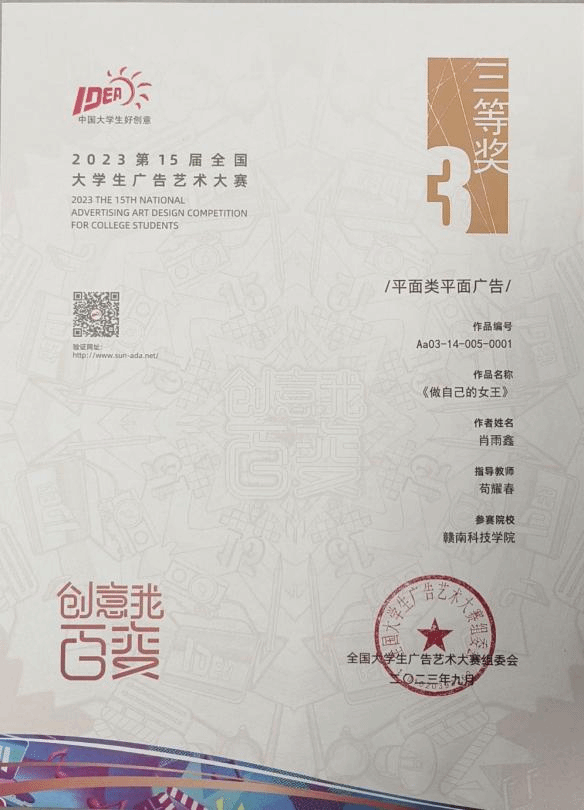 2023年第十五届全国大学生广告艺术大赛比赛成绩揭晓,在公布的获奖名单中,视觉传达设计专业师生成绩斐然、硕果累累。在选送的30件作品中电子游戏共计获得12个奖项,其中肖雨鑫同学的作品获得全国三等奖,王雨惠同学作品获得江西省一等奖,其它获奖作品分获二等奖3项,三等奖6项。