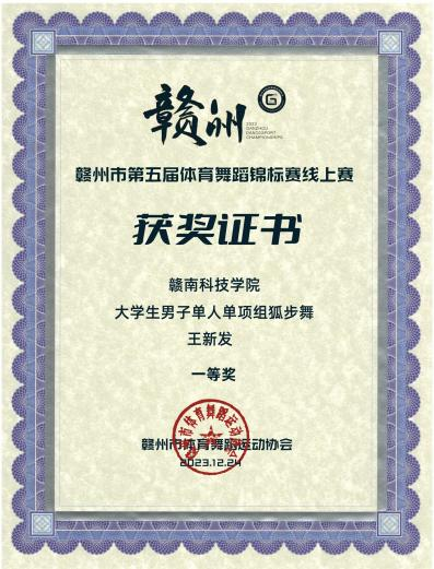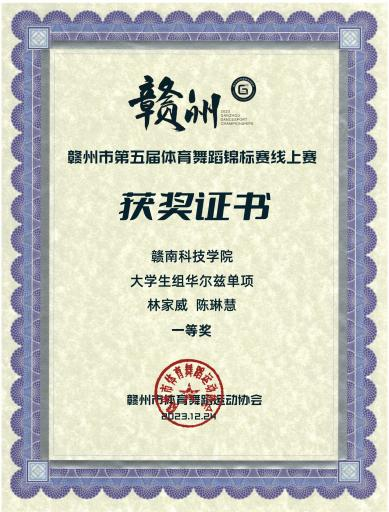 近日,2023年第五届赣州市体育舞蹈锦标赛比赛成绩揭晓,电子游戏体育舞蹈队在赣州市第五届体育舞蹈锦标赛中捷报频传,在朱少刚老师的指导下取得了18项一等奖的好成绩。其中社体212班林家威与舞伴陈玲慧获得大学生华尔兹组冠军,社体212班王新发与社体201班刘璇搭档斩获大学生探戈舞冠军,社体201班刘旺弟拿下大学生女子单人单项华尔兹、狐步舞和维也纳华尔兹3个组别的冠军,社体212班许乾超同学在男子单人单项华尔兹和快步舞上获得两项冠军。