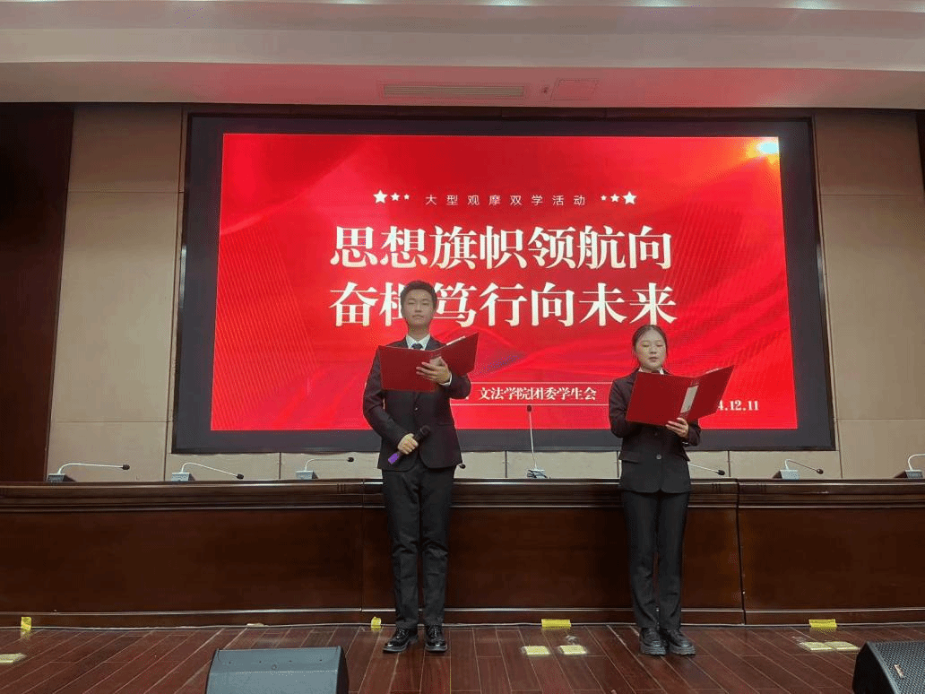本网讯:12月11日晚,pg娱乐电子游戏官网入口团委学生会在逸夫楼学术报告厅举行了以“思想旗帜领航向,奋楫笃行向未来”为主题的大型双学观摩活动。pg娱乐电子游戏官网入口党委委员王军堂老师,pg娱乐电子游戏官网入口团委负责人王金鉴老师,辅导员王奕婷老师,辅导员邹丽老师,校团委及各二级学院团委宣传部代表,pg娱乐电子游戏官网入口学生党员、团干等其他学生代表,共计260余人出席本次活动。