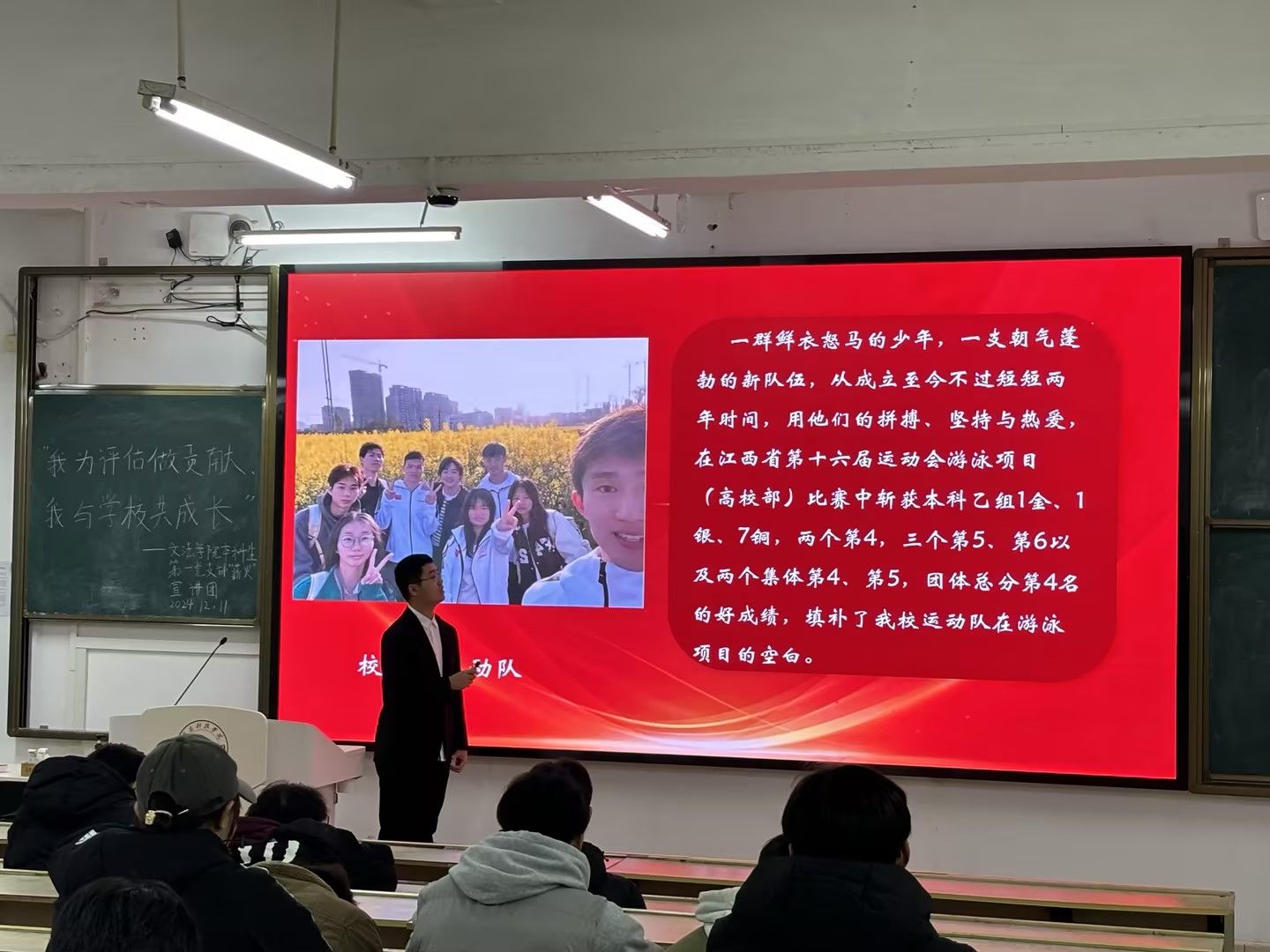 12月11日-12日,pg娱乐电子游戏官网入口本科生第一党支部“薪火”宣讲团面向全体2024级学生开展了“我为评估做贡献,我与学校共成长”主题宣讲活动。活动伊始,宣讲员带领大家共同学唱《赣科学子迎评歌》,让同学们更加直观地了解学校评估的重要性和意义。随后,宣讲员邀请同学们分享身边的榜样故事,通过讲述优秀学长学姐和教师在评估工作中的先进事迹,激励同学们向他们学习,为学校迎评促建贡献青春力量。