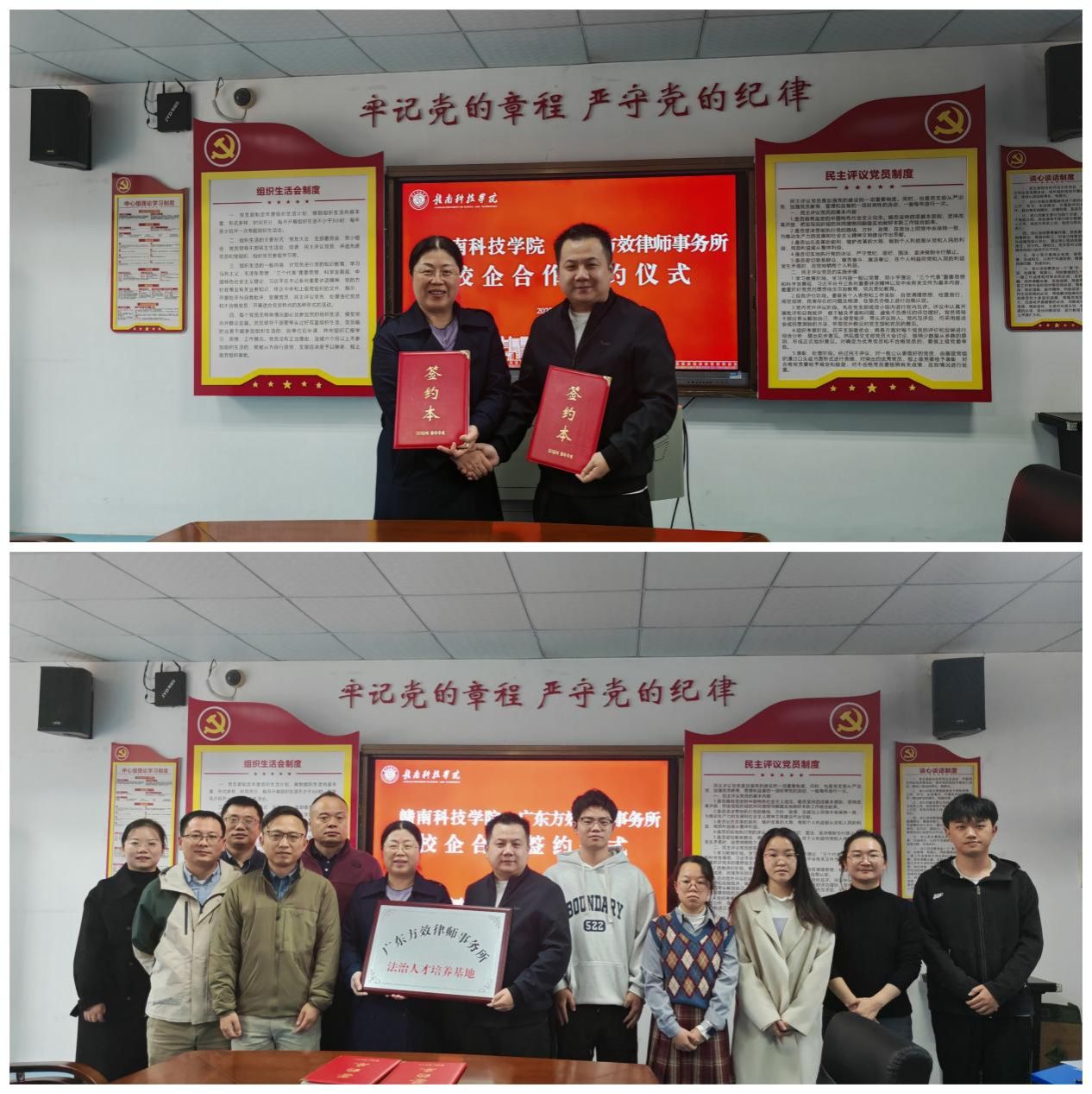 高健婕和广东方效律师事务所执行主任陈俊代表校所双方签署了《pg娱乐电子游戏官网入口 广东方效律师事务所合作共建协议》,并进行了“广东方效律师事务所法治人才培养基地”与“pg娱乐电子游戏官网入口实践教学基地”揭授牌。